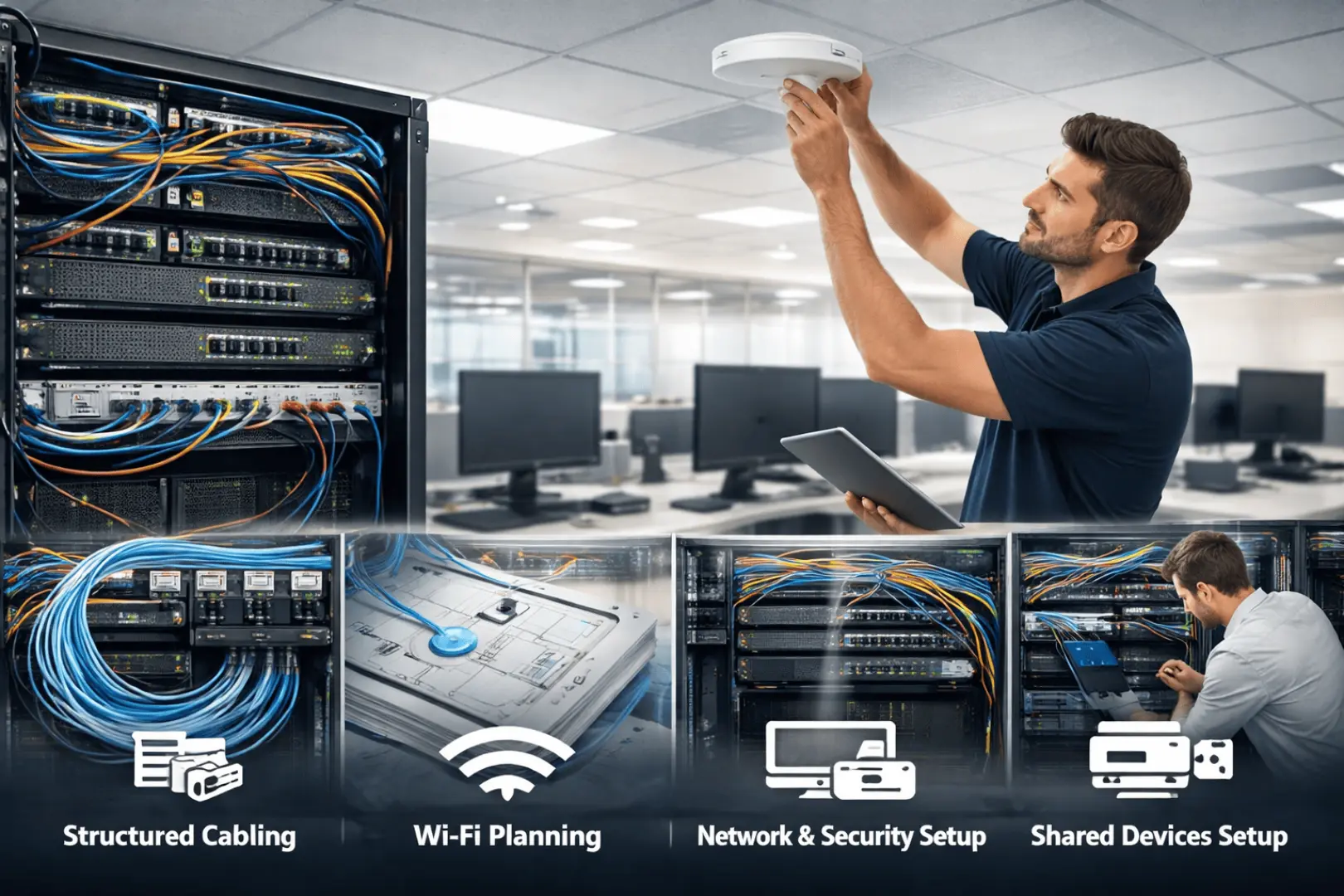 It depends on office size, number of users, cabling scope, and the number of areas that require Wi-Fi coverage. We plan the work in stages to reduce disruption.