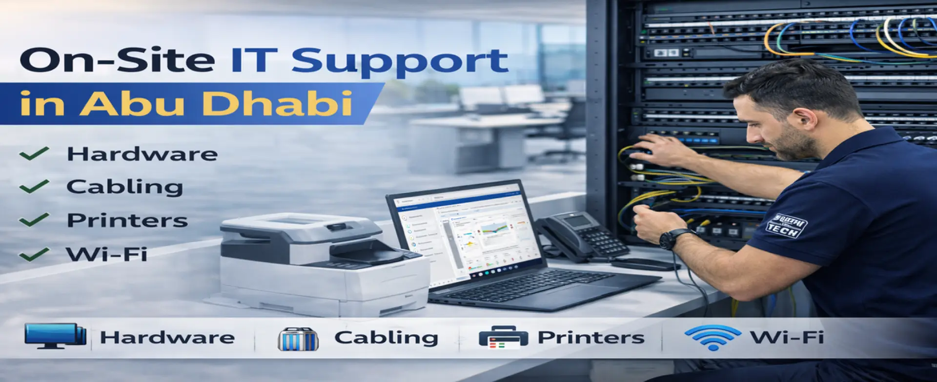When IT issues affect productivity, a remote call is not always enough. Many problems require physical troubleshooting—hardware checks, cable testing, printer setup, rack inspection, Wi-Fi access point adjustments, and office device verification. Skilled Tech Solutions provides On-Site IT Support in Abu Dhabi for businesses that need a technician on location to diagnose, fix, and test IT issues properly.