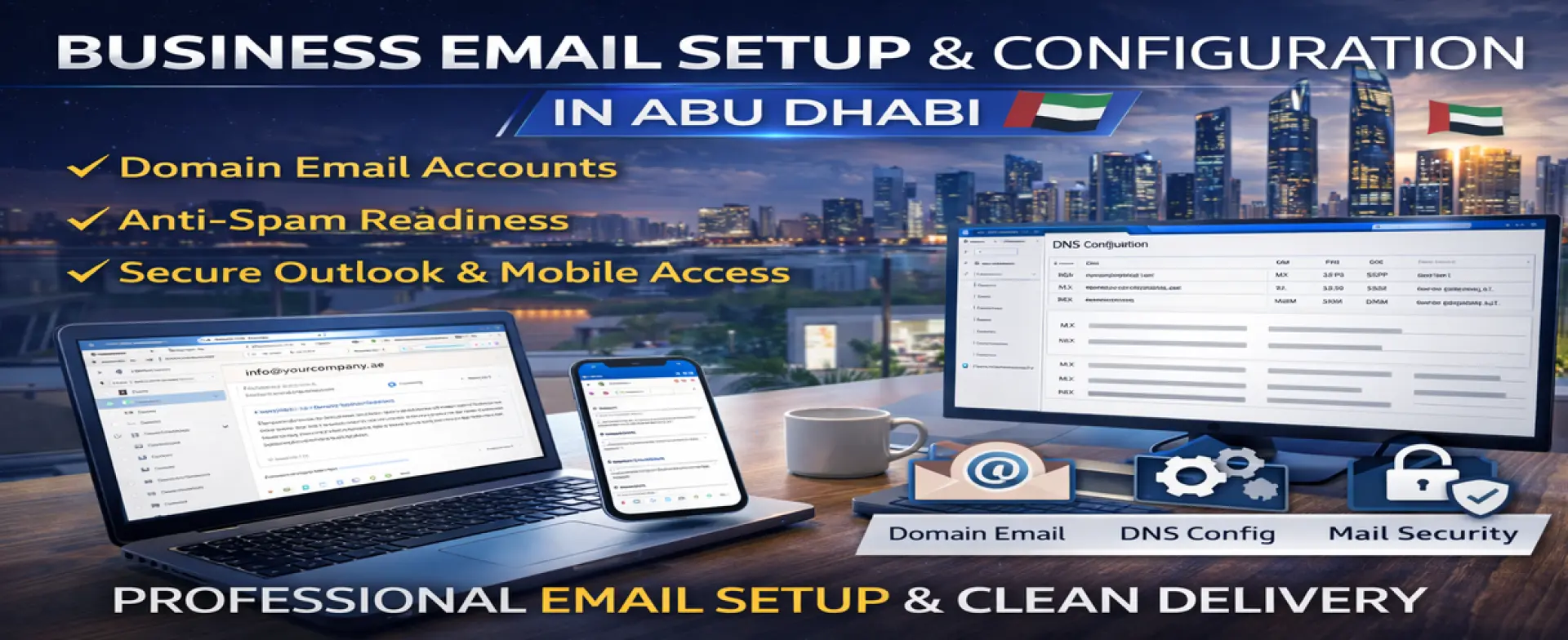Contact Skilled Tech Solutions for professional Business Email Setup & Configuration in Abu Dhabi—reliable mail delivery, clean device setup, and a stable foundation for business communication.