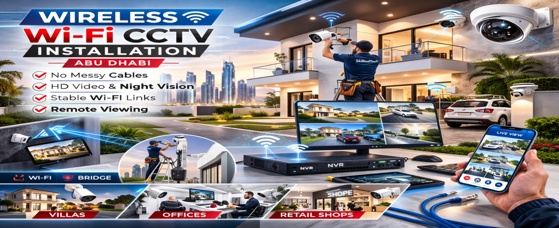 Skilled Tech Solutions provides Wireless Wi-Fi CCTV Installation in Abu Dhabi to deliver a stable wireless camera setup with proper placement planning, Wi-Fi optimization, wireless bridge solutions (when needed), NVR recording configuration, secure remote viewing, and tested handover.