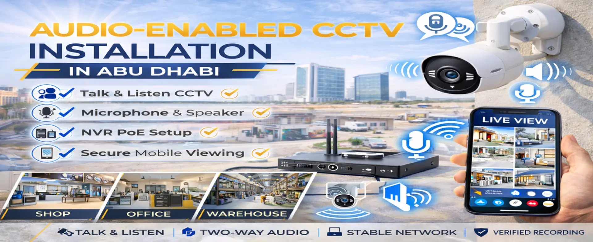 We provide audio-enabled CCTV installation for businesses and properties inside Abu Dhabi Emirate only.