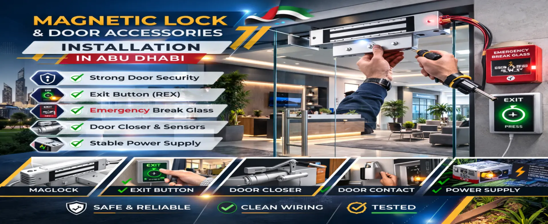 Skilled Tech Solutions provides Magnetic Lock & Door Accessories Installation in Abu Dhabi to deliver a reliable door locking setup with correct hardware selection, clean wiring, safe exit components, proper power supply sizing, and tested handover for daily business use.